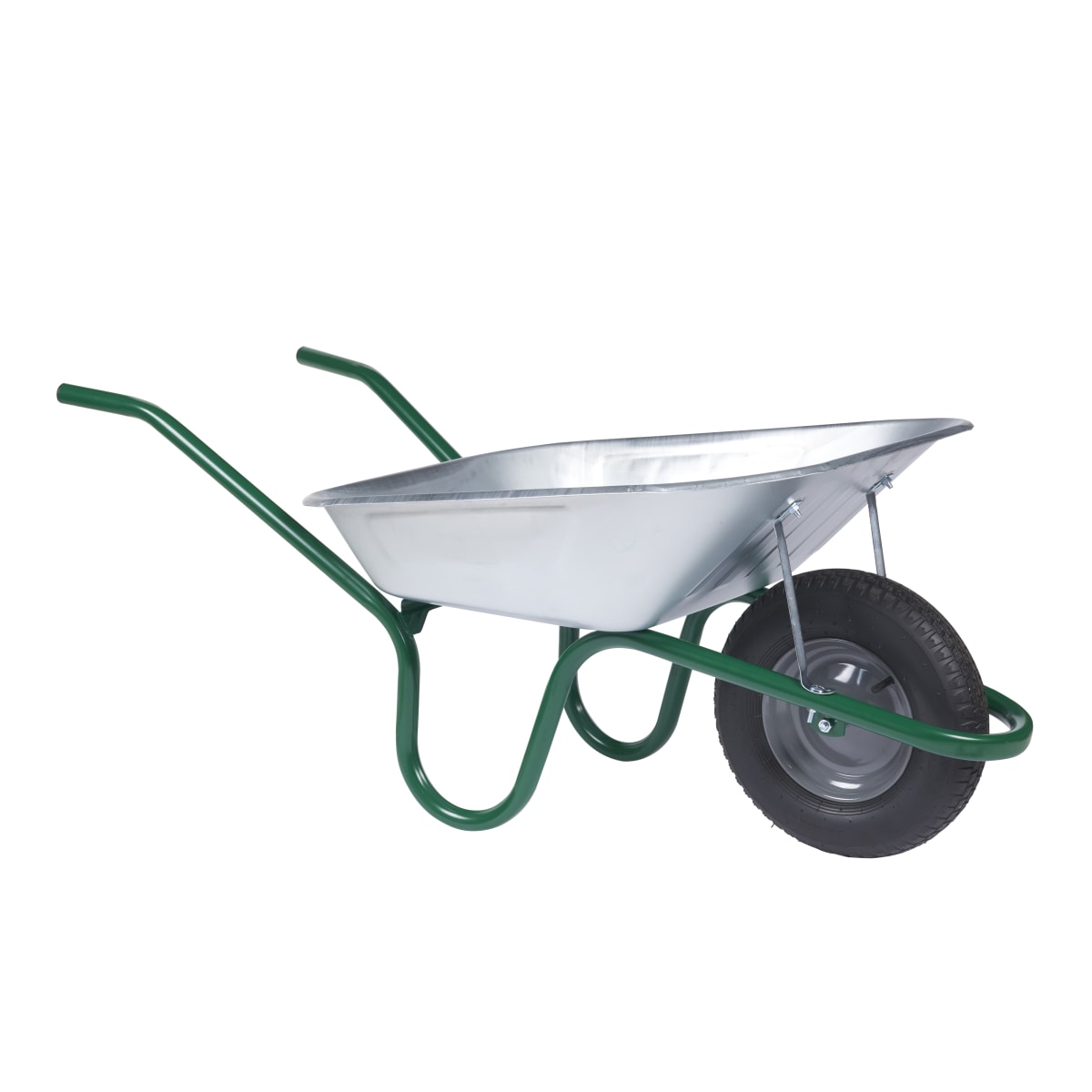 A heavy duty wheelbarrow with a 90 litre tray made from weatherproof galvanised steel. Fitted with an epoxy coated tubular steel frame with a solid front tipping bar for easier unloading. The puncture free pneumatic wheel is attached to a heavy duty hub, delivering all the reliability of a solid wheel whilst providing easy manoeuvrability across all terrains even when the wheelbarrow is fully loaded. This wheelbarrow is manufactured for professional use making it ideal for all building trades and landscape gardeners.