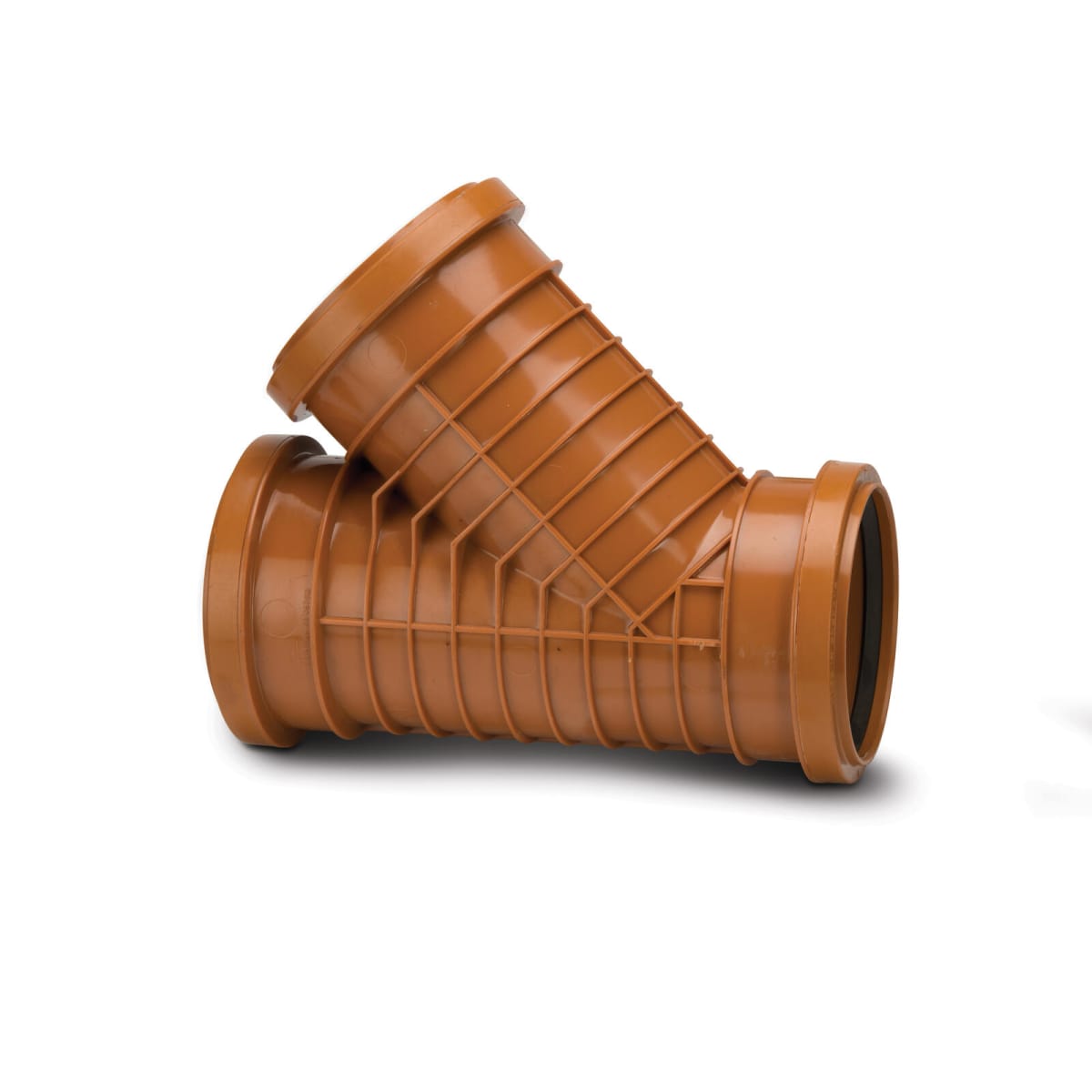 The Polypipe Polyrib 45° Triple Socket Equal Junction 110mm (Dia) Terracotta is part of the Polyrib Ribbed Fittings range. They are PVC-U fittings such as bends, reducers, socket couplers and branches, used in conjunction with PVC-U pipes, underground in domestic drainage of surface water or domestic waste water, as is permitted to be discharged into public sewers.