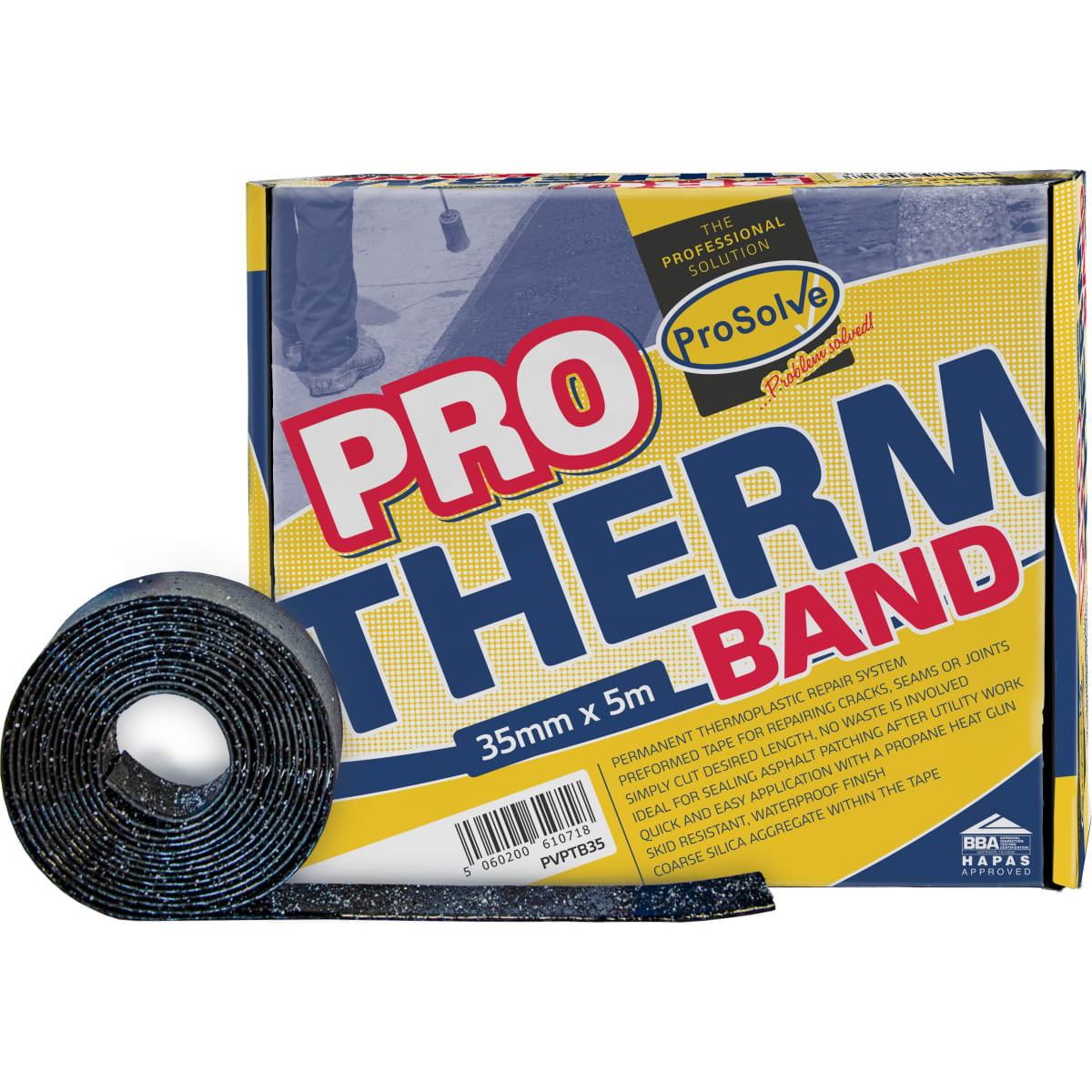 The Prosolve™ Protherm Overbanding 5m x 35mm (L x W) is suitable for use on both asphalt and concrete surfaces. This is a permanent thermoplastic repair system for cracks, seams or joints. The preformed tape has coarse silica aggregate within the tape which makes it skid resistant and waterproof. Simply cut your desired length and heat the product using a propane heat gun, no waste is involved.